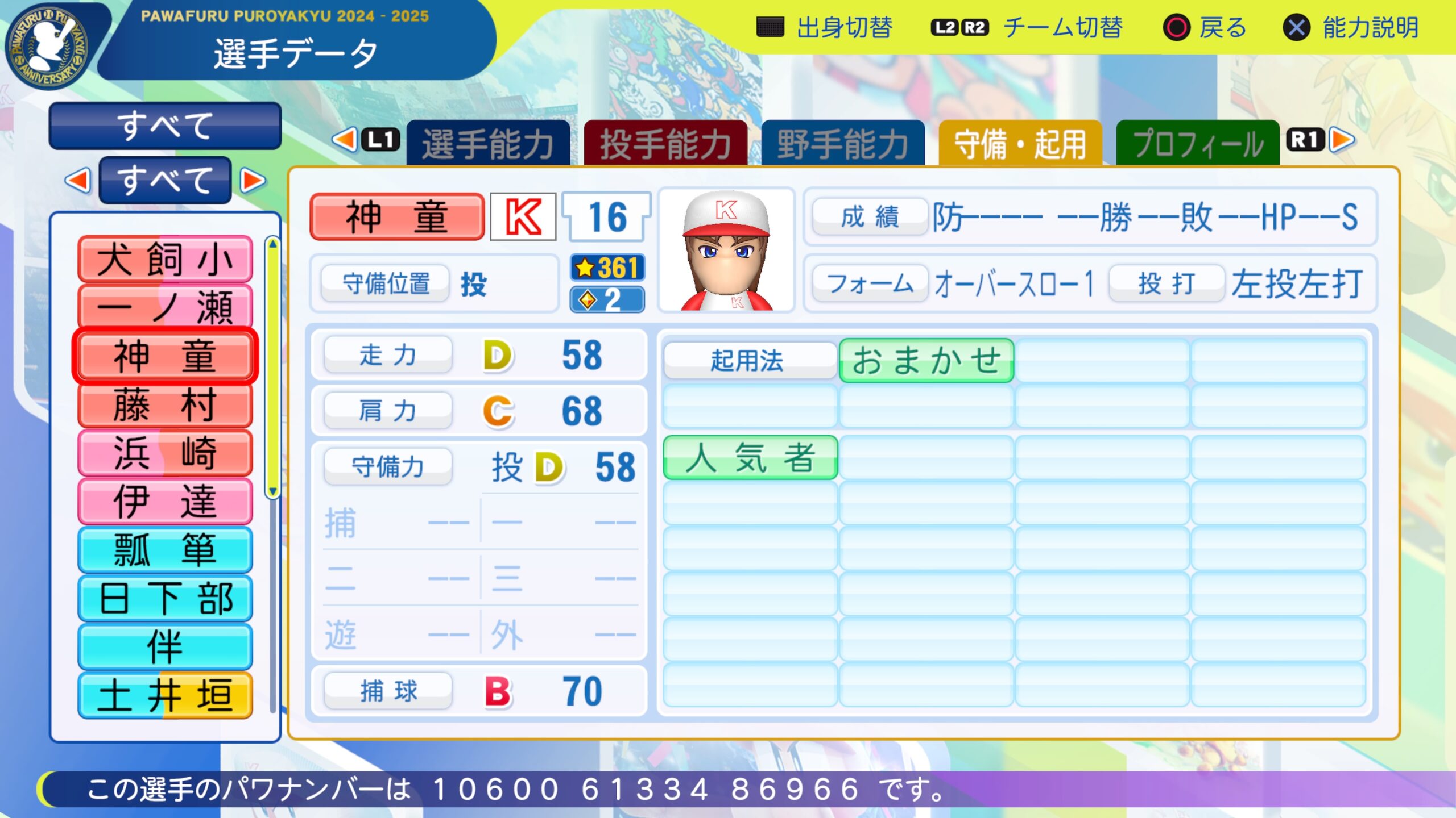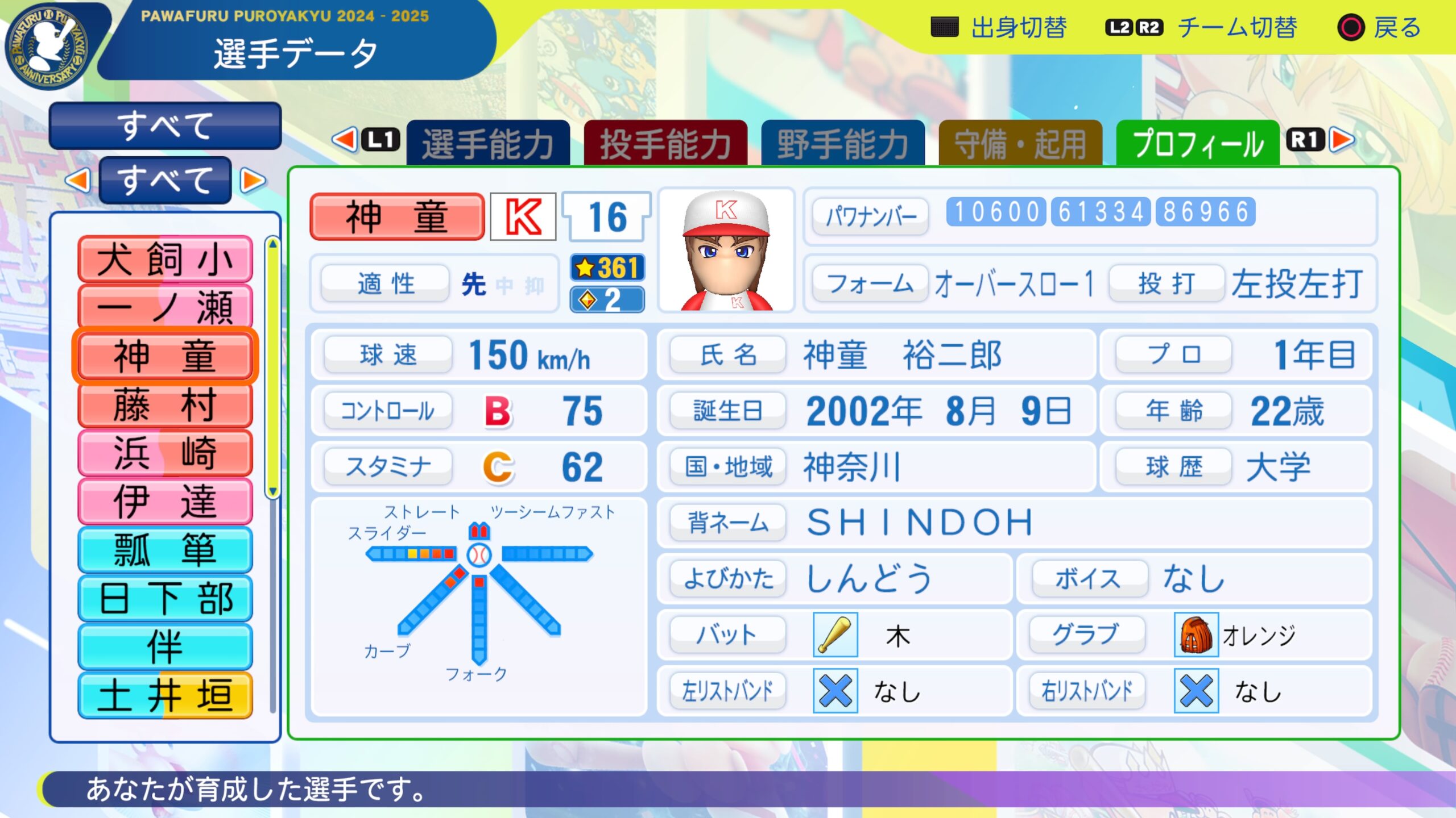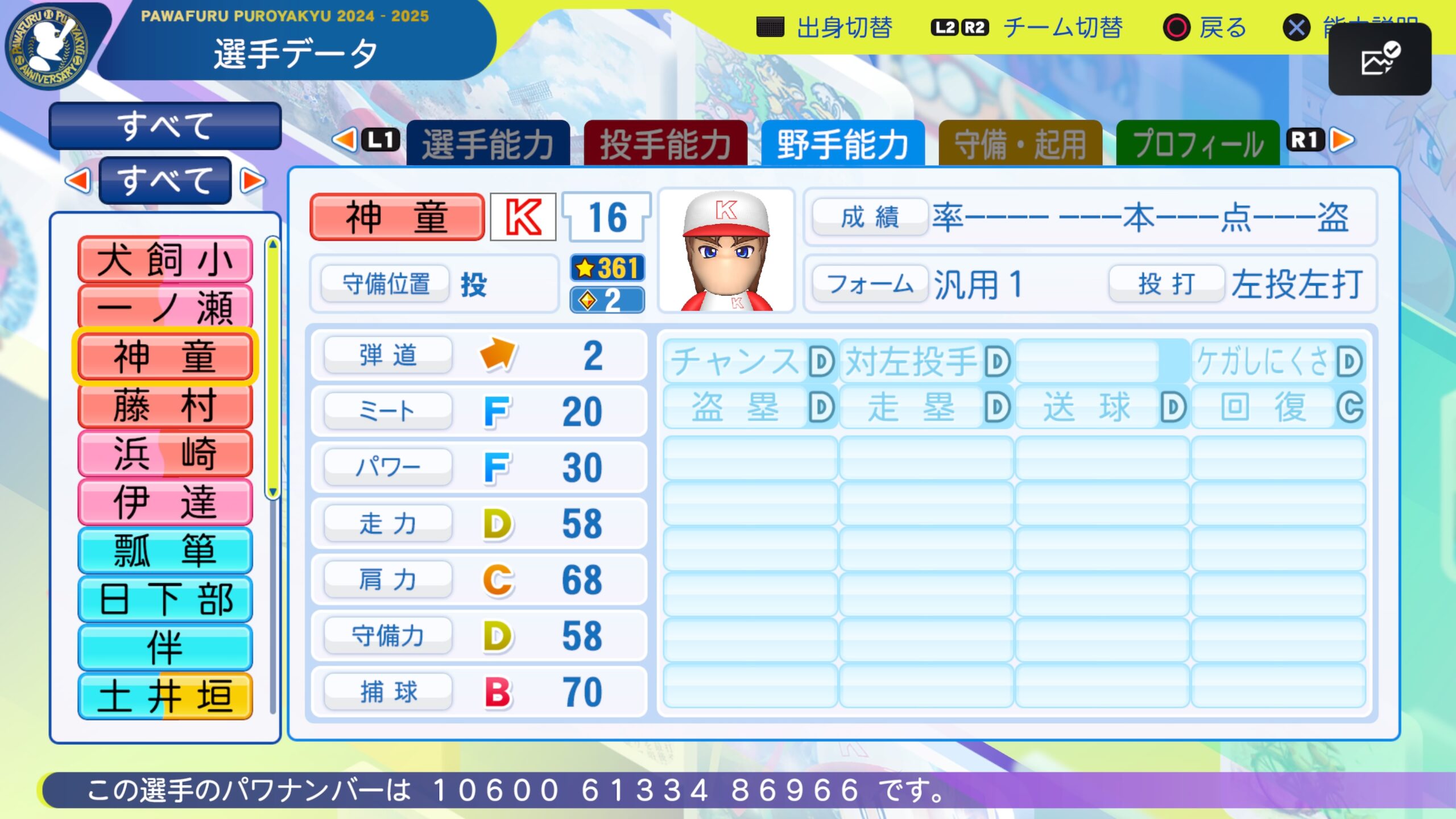 パワプロ2024-2025 サクセス選手 神童裕二郎 ドラフト査定 2025年9月27日 最終更新日時 : 2025年10月1日 rei サクセス選手 神童裕二郎 経歴 あかつき大学附属高校→あかつき大学→オリックスバファローズ→スペース・レッドエンジェルス ペナントに組み込んでみてください パワナンバーは画像の通りです \ 最新情報をチェック / @reiuraakad X