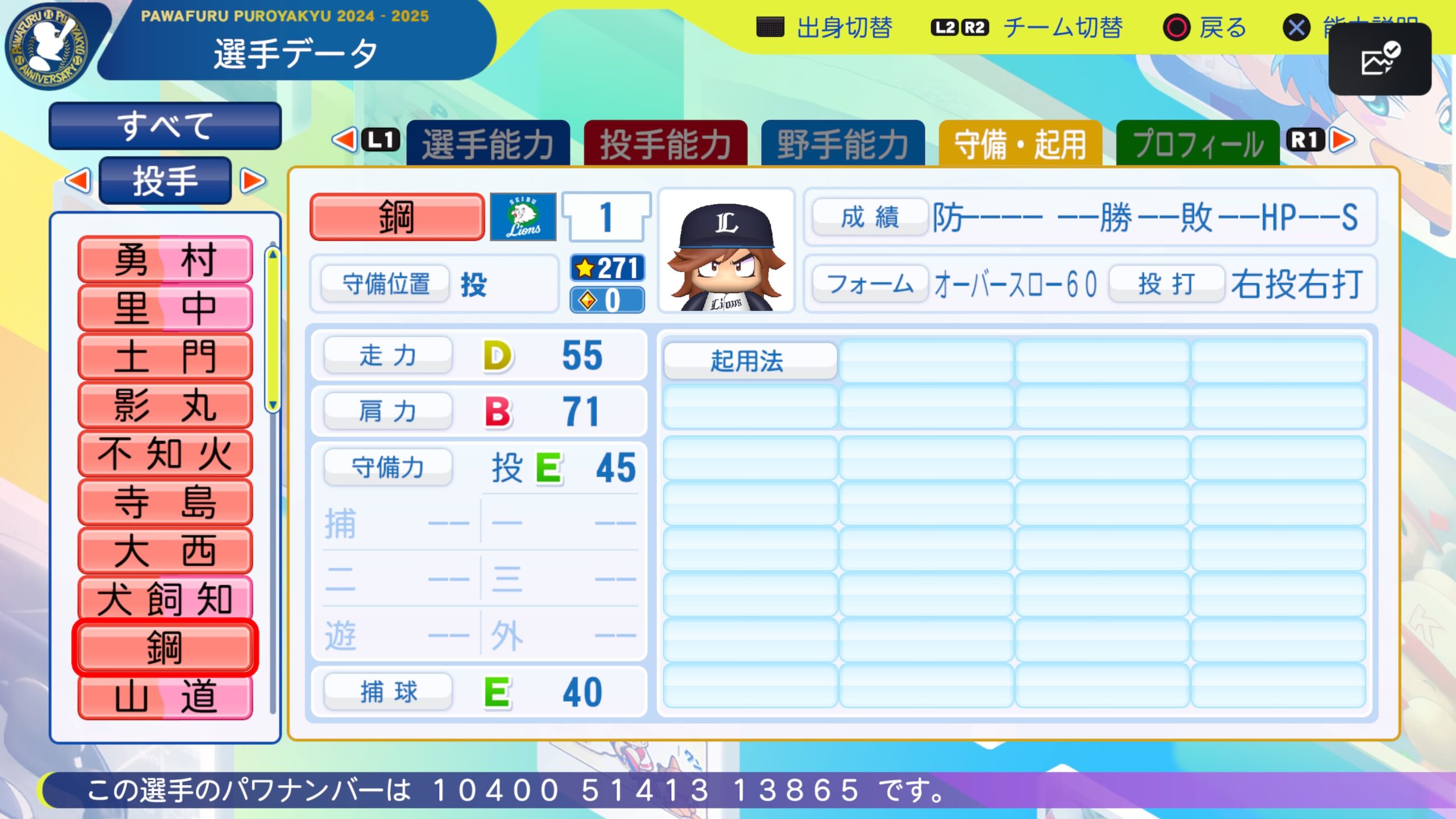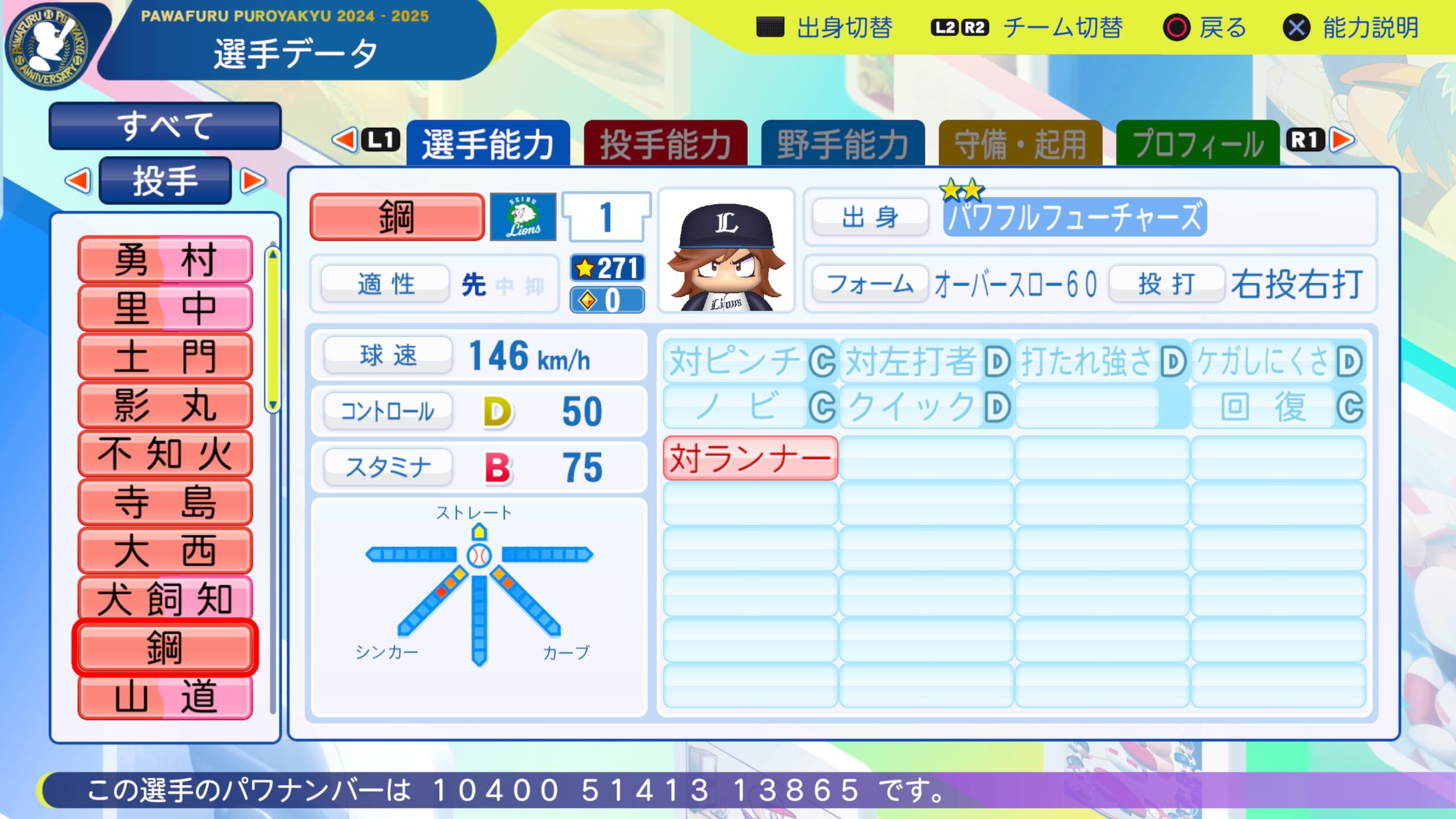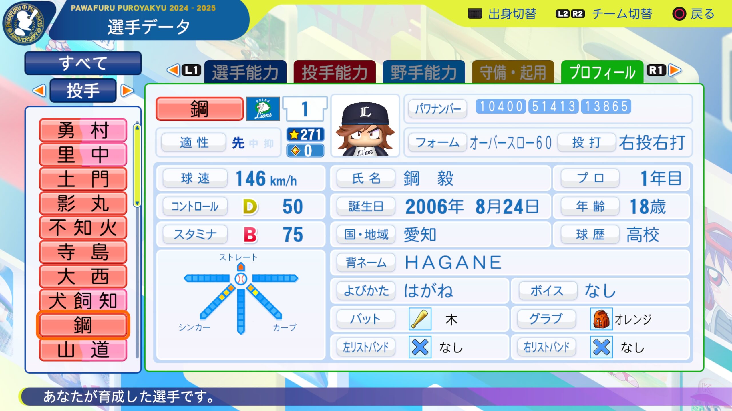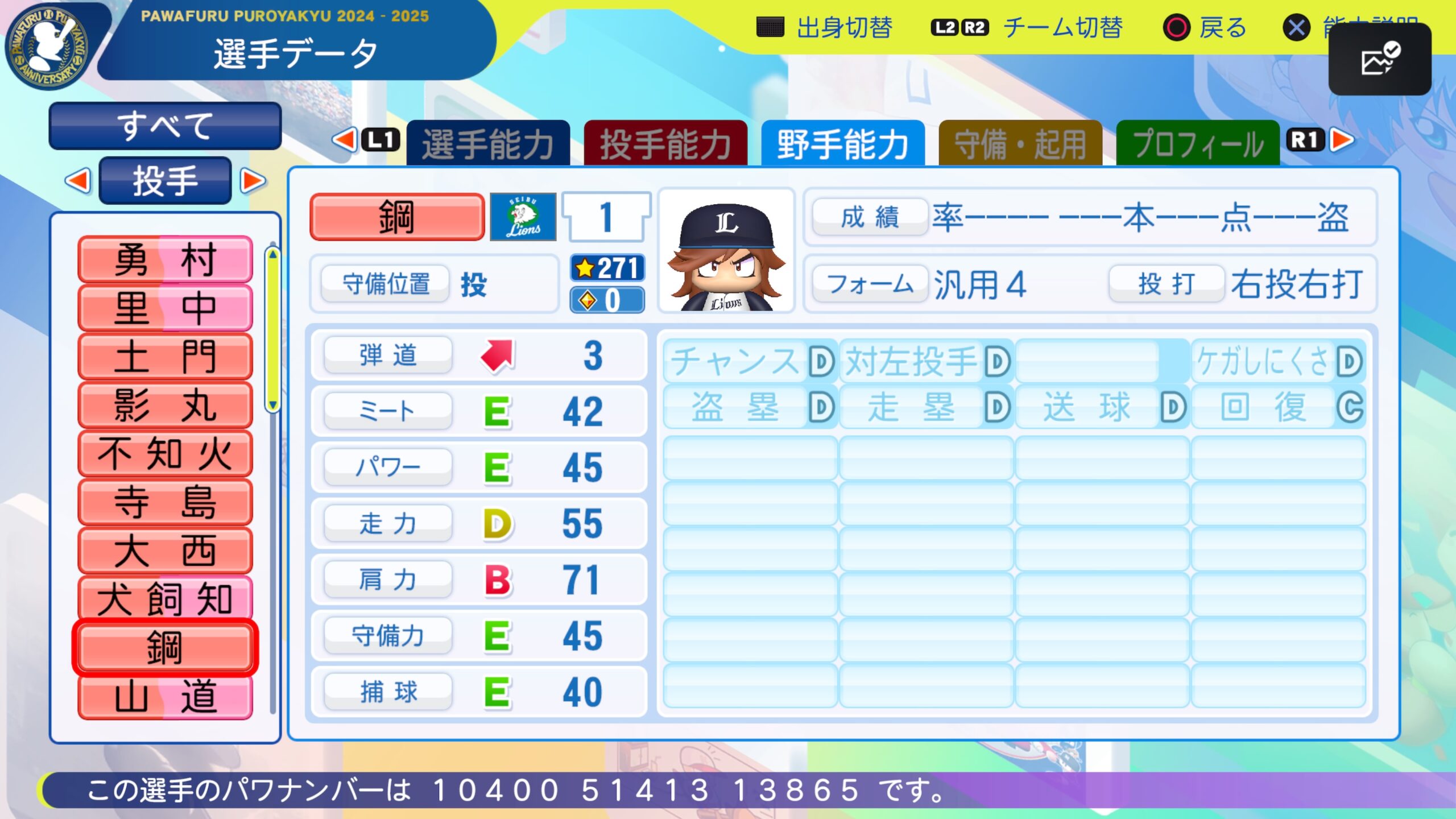 パワプロ2024-2025 サクセス選手 鋼毅 ドラフト査定 2025年11月5日 最終更新日時 : 2025年11月5日 rei サクセス選手 鋼毅 経歴 大東亜学園→ ペナントに組み込んでみてください パワナンバーは画像の通りです 中継ぎ適正つけ忘れました \ 最新情報をチェック / @reiuraakad X